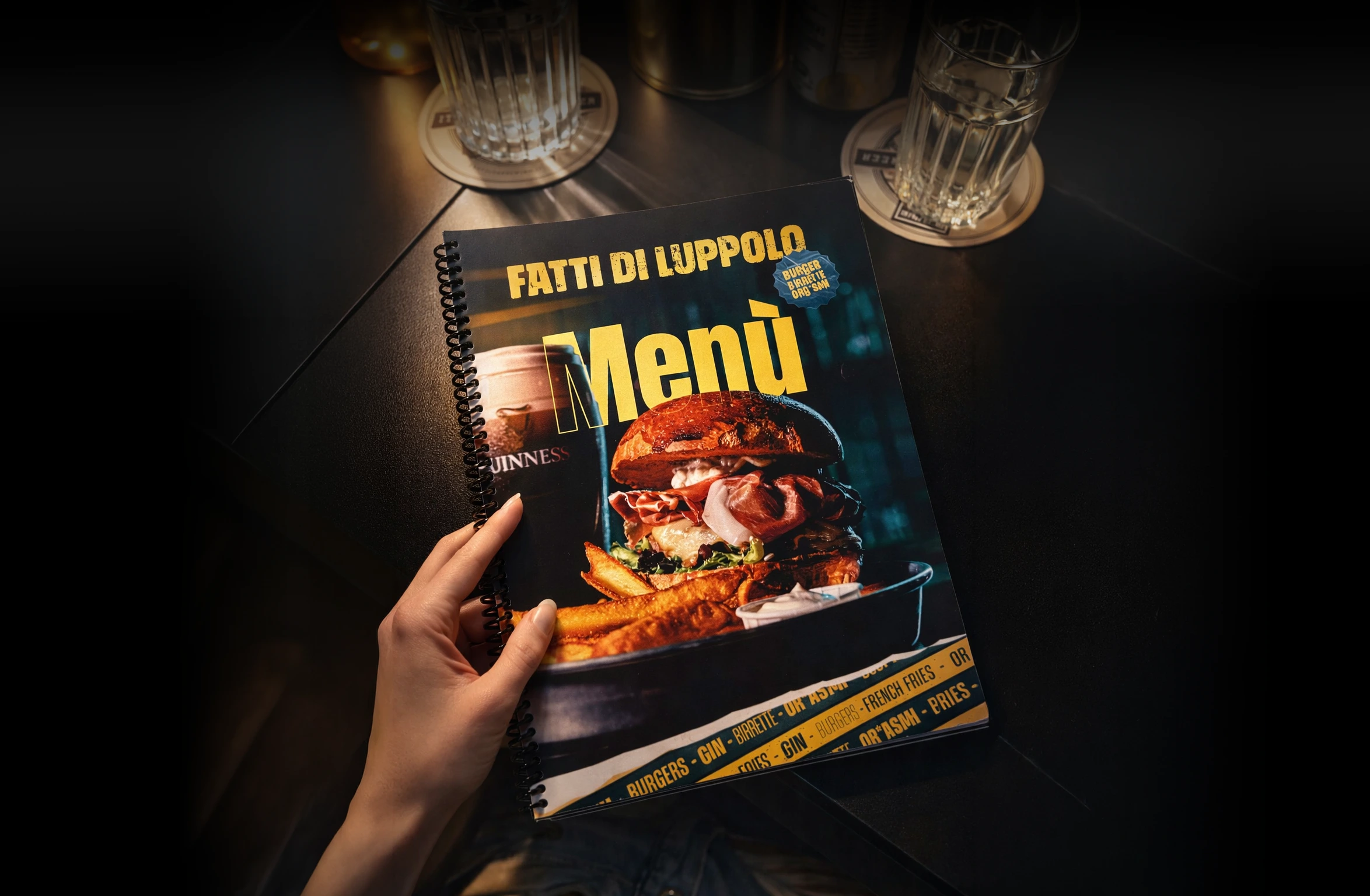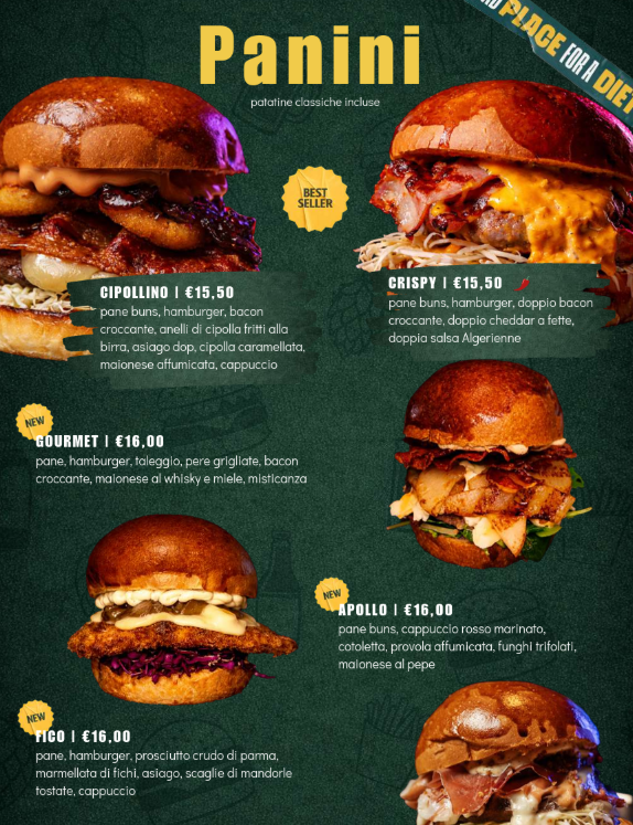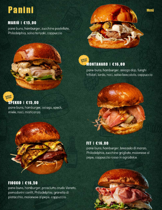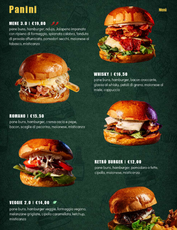 Un elemento centrale del lavoro è stato lo sviluppo delle grafiche dedicate ai panini: un linguaggio visivo forte, riconoscibile e in linea con lo spirito del pub, capace di rendere ogni proposta immediatamente memorabile e appetibile.